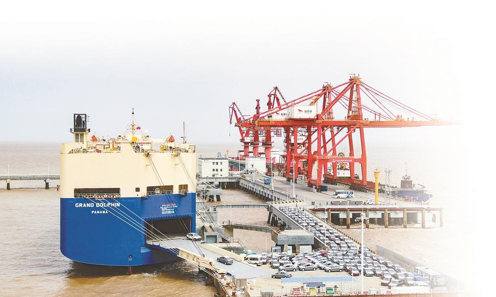 1376輛悅達(dá)商品車依次開(kāi)往鹽城港港口公司滾裝碼頭前沿裝船。 記者 王焱 攝