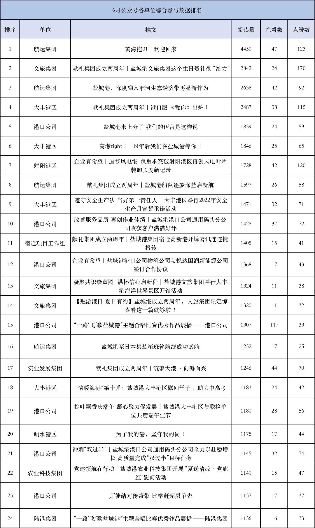 下面,讓我們一起回顧六月份鹽城港集團微信公眾平臺的精彩表現。