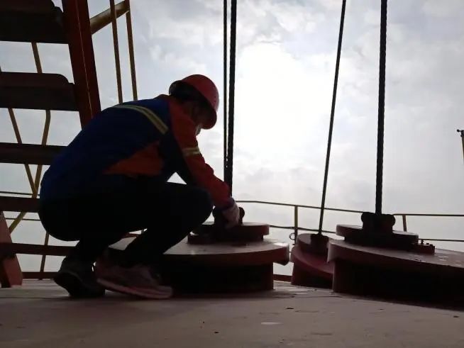 為契合“千匯018”7片118米葉片裝船,制定作業(yè)方案時(shí)已綜合考慮,其中點(diǎn)位觀測(cè)是重點(diǎn)環(huán)節(jié)也是撓頭的工作,誤差系數(shù)不能>0.05M,GPS測(cè)距儀雖然方便,但碼頭信號(hào)弱、光學(xué)量距點(diǎn)位信息混淆且誤差大。通過(guò)現(xiàn)場(chǎng)大家積極查閱相關(guān)資料,想出了“小妙招”,運(yùn)用“墊1架3側(cè)3”疊碼法,既創(chuàng)新了創(chuàng)新工藝方法,用最簡(jiǎn)單的工具發(fā)揮最大的效能;又探索出新的非標(biāo)裝船模式,滿足了客戶的需求。