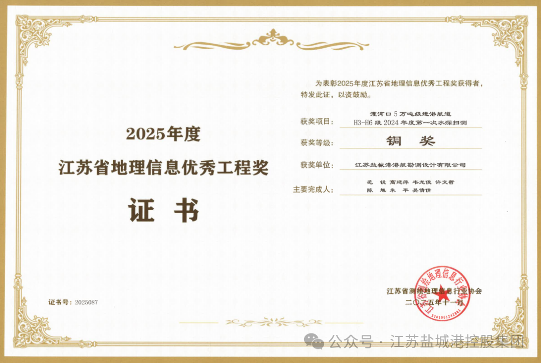 近日,江蘇省測繪地理信息行業協會正式公布2025年度江蘇省優秀測繪地理信息工程獲獎名單,鹽城港港航勘測設計有限公司憑借《灌河口5萬噸級進港航道(H3-H6)段2024年度第一次水深掃測項目》再次斬獲殊榮,成功獲評省級優秀工程銅獎,專業實力再獲行業權威肯定。